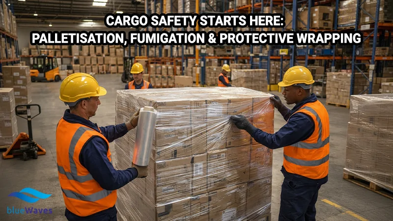 For secure cargo handling under Cargo Safety Starts Here: Palletisation, Fumigation & Protective Wrapping, Call +918690887751 or email sales@bluewaveslogistics.com.